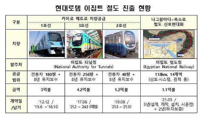 현대로템은 이집트 카이로 메트로에 사용될 전동차 320량(2호선 56량, 3호선 264량)을 2028년까지 공급한다.