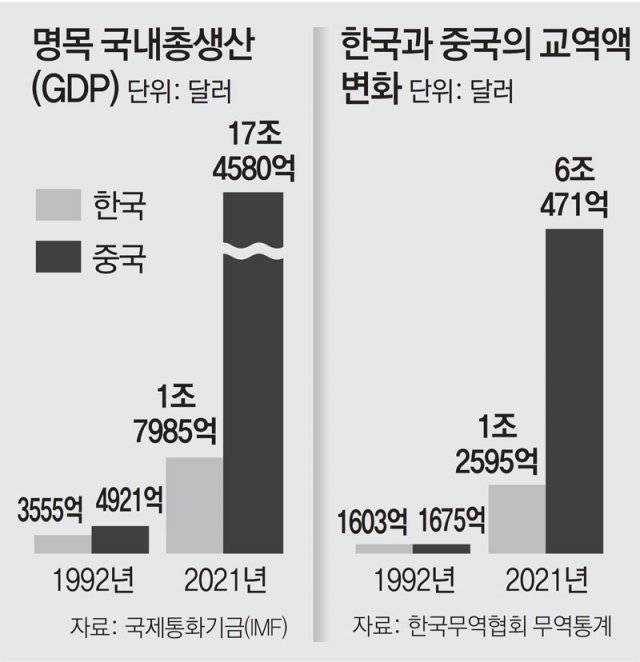 전체 교역액 기준 1992년 한국은 1603억 달러, 중국은 1675억 달러로 큰 차이가 없었지만 지난해에는 중국이 6조471억 달러로 한국(1조2595억 달러)의 약 4.8배 규모로 성장했다. 해당 기간 한국의 수출액이 8.3배 늘어나는 동안 중국의 수출액은 39.3배 늘었다.