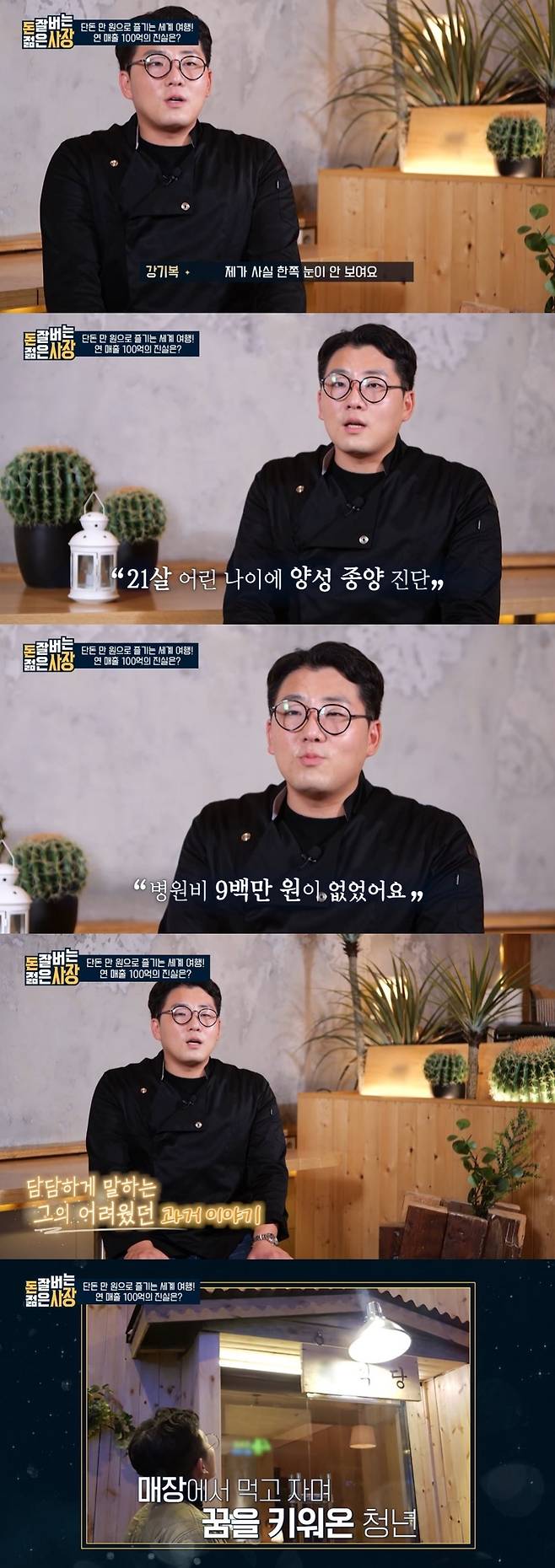 강 사장은 요식업에 뛰어들게 된 이유에 관해 묻자 "돈이 많이 없었"기 때문이라고 밝혔다. 이어 21세의 어린 나이에 양성 종양 판정을 받은 이야기를 꺼냈다.