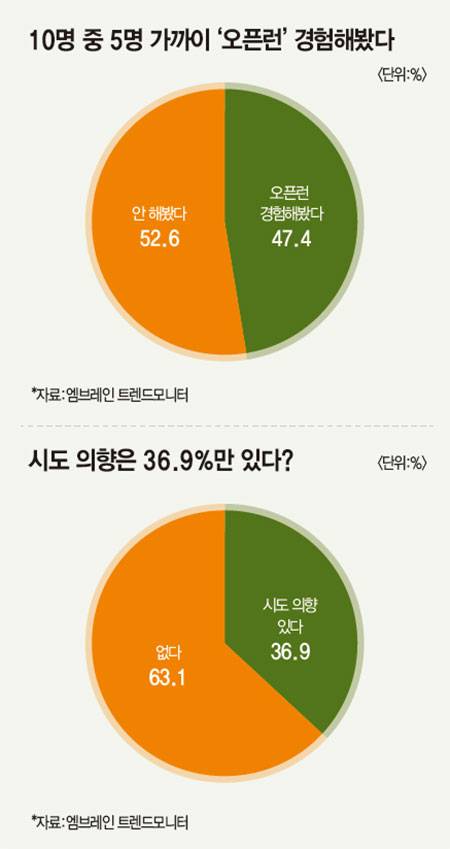 시장조사기관 엠브레인 트렌드모니터가 전국 19~59세 성인 1000명을 대상으로 설문조사한 결과, 오픈런을 경험해본 인구는 47.4%에 달하는 것으로 알려졌다. 응답자의 절반 가까이가 ‘오픈런’을 체험해본 셈이다. 주로 식당이나 음식점(22.7%, 중복응답), 놀이공원·테마파크(21.7%), 카페나 베이커리(15.7%) 등에서 오픈런을 해본 적이 있다는 응답이 많았다. 특히 여성과 저연령층, 평소 SNS를 적극적으로 이용하는 응답자에게서 오픈런 경험이 많은 것으로 나타났다. 이들은 오픈런에 평균적으로 30분~1시간 정도를 소모했다. 의류·신발 매장이나 팝업 스토어, 편집숍의 경우 상대적으로 대기 시간이 더 많이 소요되는 것으로 나타났다.