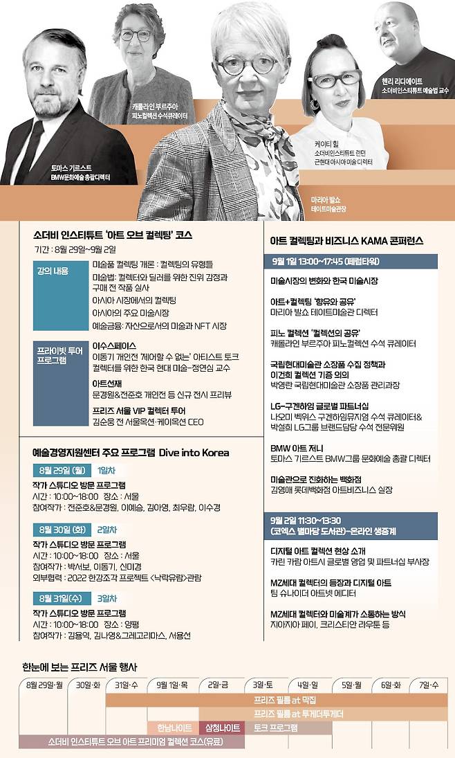 세계 양대 경매사 가운데 하나인 영국 소더비의 교육기관 ‘소더비인스티튜트 오브 아트(SIA)’는 프리즈 아트페어가 열릴 때마다 프리미엄 컬렉팅 코스를 제공해왔다. 이번에도 프리즈 서울&KIAF 기간에 맞춰 SIA 소속 교수진이 ‘이그제큐티브 코스’로 서울을 찾는다. 미국 뉴욕과 영국 런던에서 오는 전문가들은 컬렉팅을 어떻게 해야 하는지에 대한 기초 이론부터 차근차근 설명하는 기회를 갖는다. 강의는 29일부터 사흘간 컬렉팅 유형별 실무 워크숍, 컬렉터가 알아야 할 예술법과 진위 감정 및 작품 실사, 아시아 시장에서의 컬렉팅, 자산으로서의 예술 등을 주제로 진행된다.