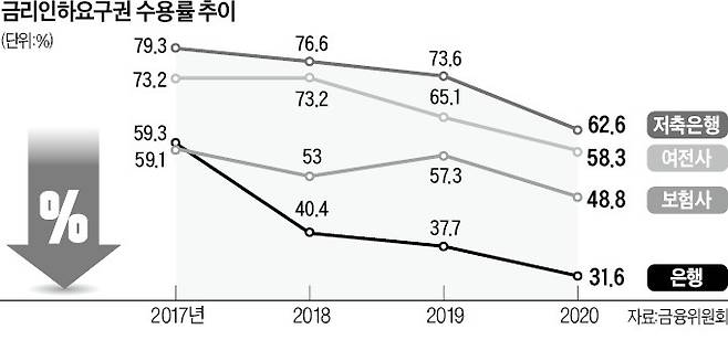 수용률은 분자인 수용건수 증가폭보다 분모인 신청건수 증가폭이 크면 떨어진다. 실제 갈수록 금리인하요구권에 대한 홍보와 인식이 개선되고 신청 절차가 편리해지면서 수용률이 떨어지고 있다. 금융위에 따르면 2017년 61.8%였던 금리인하요구권 수용률은 2020년 37.1%로 하락했다. 지난해 상반기 은행권 수용률은 이보다 더 낮은 26%대였다. 한 은행 관계자는 “비대면 신청을 간소화하고 신청 횟수·시점에 제한을 두지 않다 보니 요건을 충족하지 못하는 소비자도 수시로 중복 신청하면서 신청건수가 폭증했다”고 말했다.