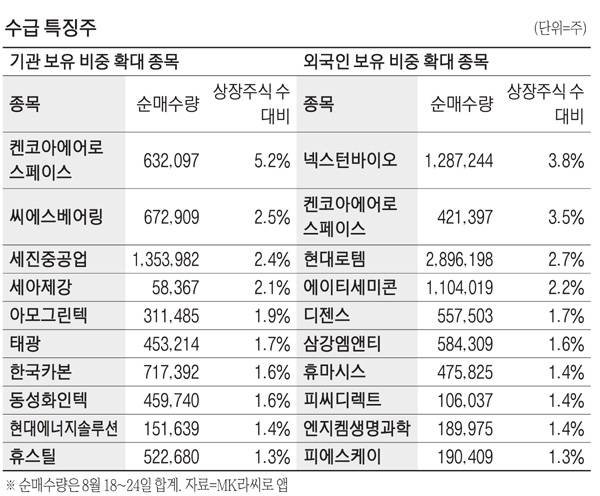 한 주 동안 기관투자자들이 보유 비중을 확대한 종목들은 켄코아에어로스페이스, 씨에스베어링, 세진중공업, 세아제강, 아모그린텍 등으로 나타났다.