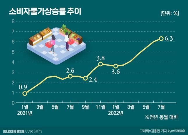 실제 이날 한은 역시 고물가에 대한 경계감을 이어가는 모습이었다. 이날 한은은 올해 소비자물가상승률 전망치를 기존 4.5%에서 5.2%로 상향 조정했다. 이는 1998년 이후 가장 높은 수준의 전망치다. 올해 하반기 평균 예상치는 5.9%다