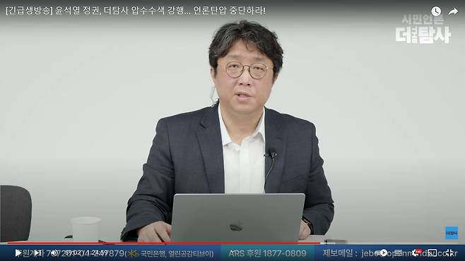 | ▲ 윤석열 대통령 부인 김건희 여사의 과거 의혹을 보도한 <더탐사(옛 열린공감TV)>를 상대로 경찰이 25일 압수수색을 진행하자 박대용 기자가 긴급생방송을 편성해 항의하고 있다. |