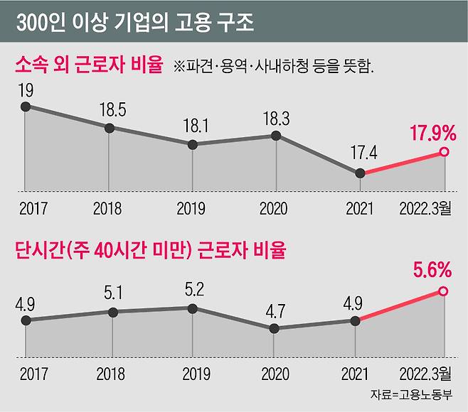 기업의 고용구조는 기본적으로 경기에 영향을 받지만, 정규직과 비정규직의 비율 문제는 정책과 더 큰 관계가 있다. 전문가들은 전임 정부 시절 ‘노동시장 이중구조’ 문제가 더 심화됐다고 지적한다. 노동시장 이중구조란 원청과 하청, 대기업과 중소기업, 정규직과 비정규직 등 임금과 고용 안정성이 질적으로 다른 두 개로 노동시장이 쪼개져 있는 것을 뜻한다. 노동 전문가인 정승국 중앙승가대 교수는 “(전임 정부 시절) 이중구조 문제를 그대로 놔둔 채 비정규직의 정규직화 정책 등을 밀어붙이다 문제가 더 심각해졌다”고 했다. 소속 외 근로자나 기간제·단시간 근로자가 늘었다는 것은 이런 이중구조가 심화됐다는 방증으로 볼 수 있다는 것이다.