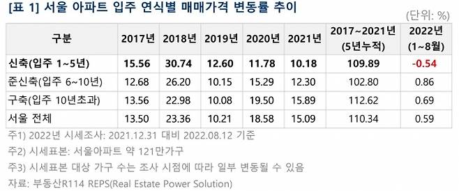 금리인상 여파로 최근 서울 아파트값이 약세 흐름으로 전환했지만, 준공 5년 이내 신축 단지를 제외하면 누적 상승률은 여전히 우상향한 것으로 나타났다.