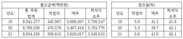매년 발표되는 국세통계연보 중 주류 통계는 1년 정도 늦은 결과를 반영한다는 아쉬움이 있지만 가장 정확한 통계이기에 그 중요성은 매우 크다. 얼마 전 2022년도 주류통계연보 1분기가 공개(2021년도 주세 반영)되었다. 12월 국세통계 연보를 발간하기 전에 발표 가능한 통계는 일찍 활용할 수 있게 공개한 것이다.
