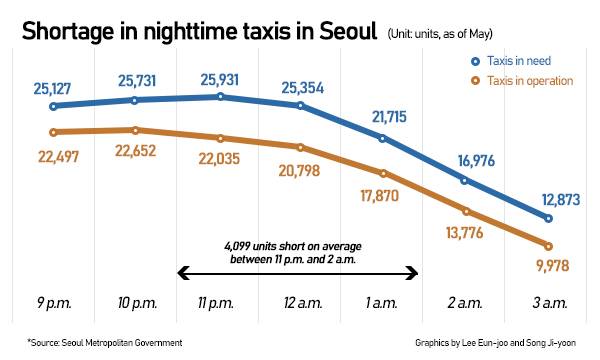 According to Seoul Metropolitan Government, about 4,099 taxis are short in the capital from 11 p.m. and 2 a.m. as of May and 4,556 lacking at around midnight.