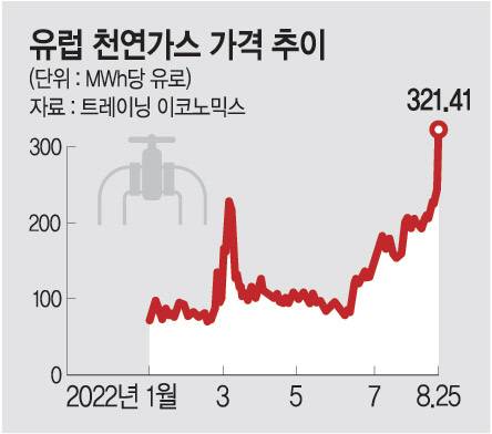 시장조사업체 트레이딩 이코노믹스에 따르면 이날 유럽 천연가스 가격의 벤치마크인 네덜란드 TTF 선물 가격은 MWh당 321.41유로로 마감됐다. 종가 기준으로는 사상 최고치며, 장중 가격까지 포함하면 러시아의 우크라이나 침공 직후인 3월 초 기록했던 345유로에 근접한 가격이다. 1년 전 유럽 천연가스가 MWh당 약 50유로 수준이었음을 감안하면 6배 이상 상승한 수준으로 평가된다.