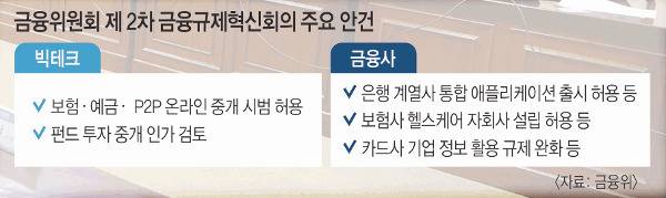 구체적인 회의 안건은 ‘빅테크(대형 정보기술(IT) 기업)의 온라인 금융상품 중개 허용’이다. 현재 빅테크는 대출상품에 한해서만 온라인 가격 비교 서비스를 제공할 수 있는데 이 범주를 보험, 예금, P2P(대출 수요자 대 공급자) 금융으로 확대하겠다는 내용이다. 현재 대출만 중개하는 토스, 핀다 등은 더 많은 금융 상품을 고객에게 추천할 수 있게 됐다.