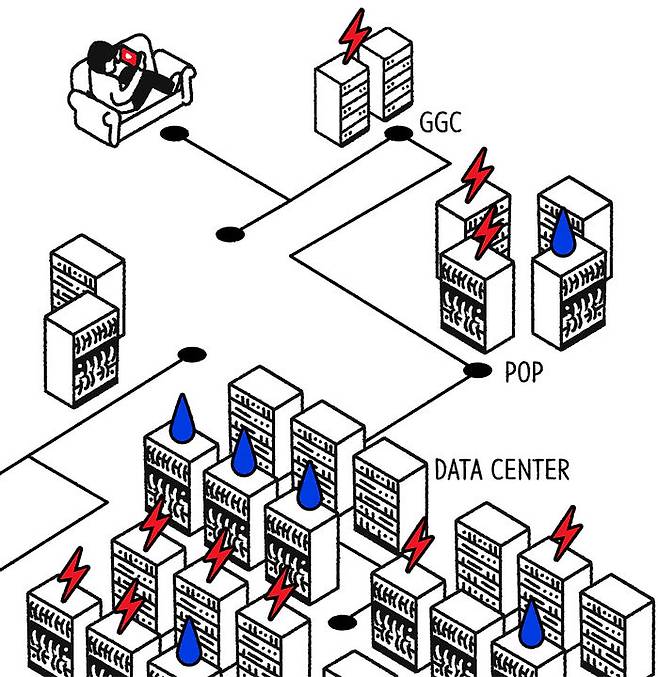 이 데이터 센터를 유지하는 데 상당한 물과 전기가 들어요. 물이 왜 필요한지 알려면 컴퓨터, 혹은 스마트폰의 발열을 생각하면 될 거예요. 컴퓨터를 통해 여러 작업을 하면 상당한 열이 발생합니다. 인터넷 창을 많이 열어두었다거나, 여러 프로그램을 동시에 실행했을 때 컴퓨터에서 쿨러가 위잉 하고 돌아가는 것 한 번쯤 경험해 본 적 있을 거예요. 데이터를 제대로 처리하고 통신에 과부하를 막기 위해 냉각시설인 쿨러가 돌아가는 건데, 그보다 더 큰 규모의 데이터 센터에선 당연히 냉각에 들어가는 물이 엄청납니다.