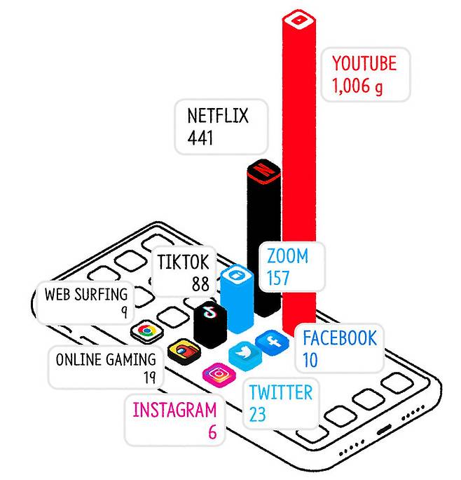 계산해보면, 대한민국 평균 사람이라면 SNS 이용만으로 한 달에 3,398그램의 탄소를 배출하는 셈입니다. 우리나라 SNS 이용자는 2021년 4월 기준 3,495만 4,543명. 삼천만 명 이상의 SNS 이용자들이 평균적인 소비를 했다면, 한 달 간 배출하는 탄소의 양은 무려 11만 8,780톤이라는 계산이 나오죠. 온라인 서비스는 국적을 가리지 않는 만큼, 전 세계 단위로 보면 그 규모는 더 커질 거고요.