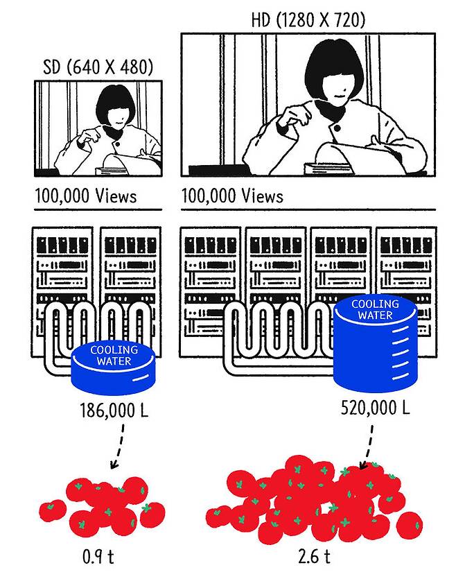 상당한 탄소가 배출되는 만큼 IT 기업들도 변화를 꾀하고 있습니다. 일단 스트리밍 서비스에선 화질을 관리하는 정책을 펼치고 있죠. 우리가 보는 동영상의 화질을 고화질에서 저화질로 바꾸면 시간당 탄소배출량이 440.6그램에서 157.3그램으로 감소합니다. 물 사용량도 시간당 5.2리터에서 1.9리터로 확 줄어들고요. 만일 10만 명의 이용자들이 한 시간 짜리 동영상의 화질을 낮춰서 본다면, 1.7톤의 토마토를 생산할 만큼의 물을 절약할 수 있게 됩니다. 하지만 광고로 나오는 동영상의 화질은 여전히 고화질이라서 이용자에게만 저화질을 보게 한다는 지적을 받기도 하죠.