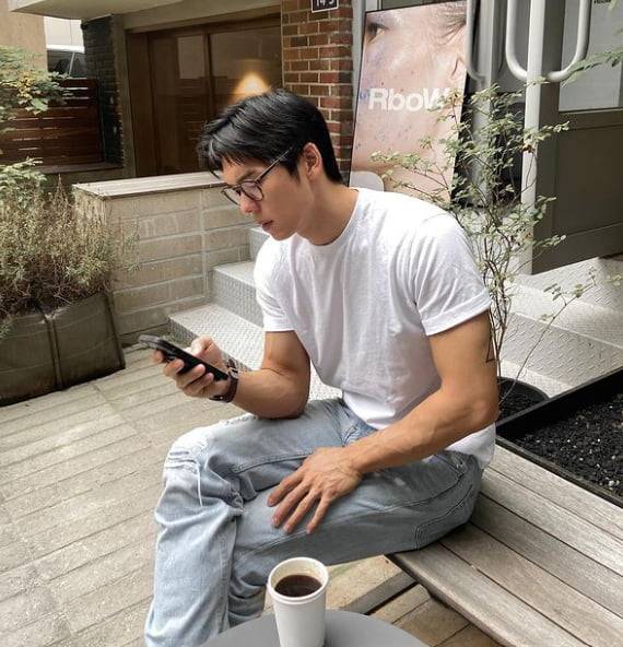 공개된 사진 속 오스틴 강은 눈부신 남신 비주얼을 뽐냈다. 그는 넓은 어깨가 돋보이는 흰색 무지 티셔츠를 입은 모습.
