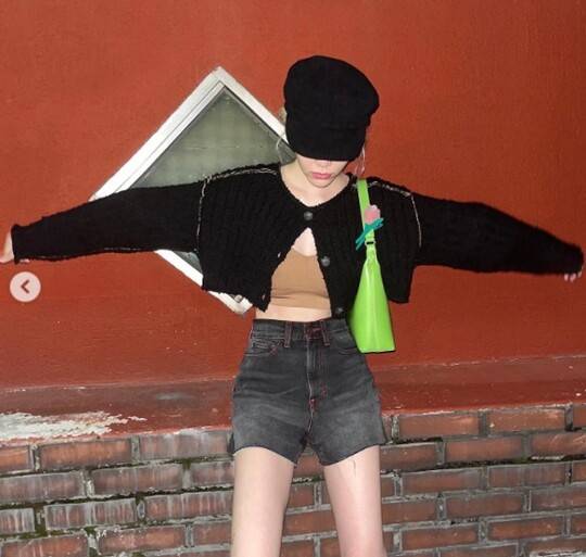 공개된 사진 속에는 브라톱에 핫팬츠를 입고 카디건을 걸친 지민의 모습이 담겼다.