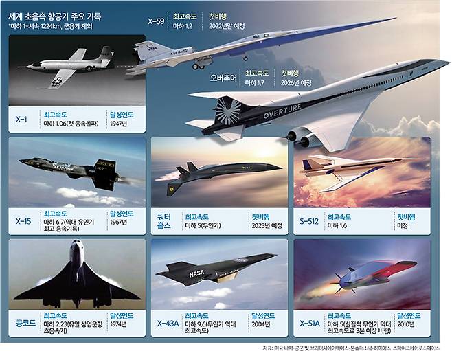 세계 첫 초음속 비행기는 1940년대 미국 벨사가 만든 X-1이다. 미국 공군과 국가항공자문위원회(NACA: 나사의 전신)가 만든 실험용 비행기다. 1947년 10월 척 예거 공군 대위가 X-1을 마하 1.06(마하1=시속 1224㎞)의 속도로 비행하면서 항공역사의 새로운 장(章)을 열었다.