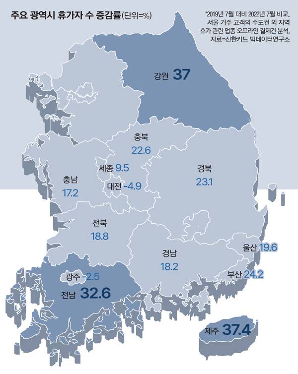 2019년 7월과 2022년 7월 휴가 관련 업종 오프라인 결제건을 비교한 결과 휴가자 수 증가율은 제주가 37.4%로 가장 높았다. 이어 강원(37%) 전남(32.6%) 순이었다. 제주도는 해외 여행 대체지로 선택하는 이들이 많았고 강원도는 자가용으로 접근할 수 있는 휴양지(바다)로 인기를 모았다.