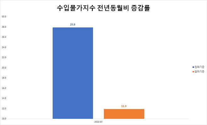 29일 통계청에 따르면 수입물가지수 전년동월비 증감률은 지난 7월 원화기준으로 27.9%를 기록했다. 달러기준으로 보면 11.9%였다. 원화 기준 증감폭이 달러 기준보다 2.3배 더 높았다. 원·달러 기준 수입물가 증감폭 차이는 올해 1월 1.5배 수준이었다. 지난 4월까진 1.4~1.5배 수준을 유지하다 5월 1.8배를 기록하더니, 그 격차가 커지는 모양새다.
