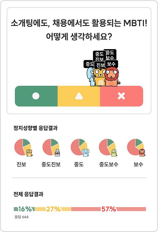 20만명 회원을 보유한 정치 데이터 플랫폼 ‘옥소폴리틱스’가 ‘MBTI 어떻게 생각하세요’라는 주제로 설문 조사(응답자 666명)를 진행한 결과, MBTI 활용에 ‘찬성’하는 이는 전체 16%에 불과했습니다. ‘반대’는 찬성 의견 세 배가 넘는 57%에 달했습니다. ‘모르겠다’라며 중립 입장을 표명한 이는 27%였어요.