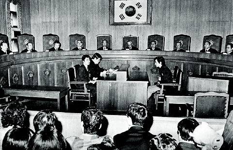 | ▲ 1975년 4월 8일 민복기 당시 대법원장이 인혁당재건위 사건 관련자들에 대해 사형 등을 확정하는 판결문을 읽고 있는 모습. |