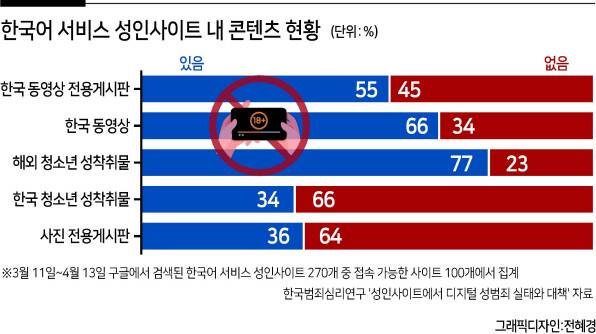 한국어로 서비스하는 성인사이트 10곳 중 7곳 이상에 아동·청소년 성착취물이 올라와 있는 등 방대한 양의 불법 콘텐츠가 소비·유통된다는 분석이 나왔다.
