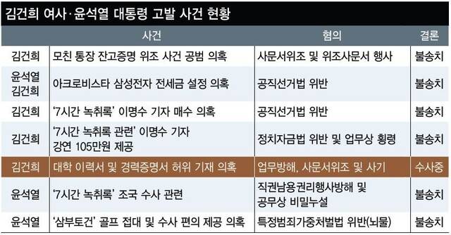 한편 김 여사의 각종 의혹에 대한 경찰의 불송치 결정은 계속되고 있다. 경찰은 지난 10일 ‘7시간 통화 녹취록’과 관련해 대통령 부부가 직권남용권리행사방해와 공무상비밀누설 혐의로 고발된 사건을 불송치했다. 최근 김 여사가 윤 대통령 선거운동을 위해 이명수 <서울의소리> 기자에게 강의료 명목으로 돈을 줬다는 혐의(정치자금법 위반 등)는 증거불충분으로 불송치 결정이 났다. 여기에 지난 5월 김 여사가 어머니의 잔액증명서 위조 사건의 공범으로 고발된 사건도 불송치했다.