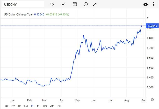 29일 무역·금융 정보 사이트 트레이딩 이코노믹스에 따르면 이날 역외 달러·위안 환율이 6.9위안을 돌파했다. 2년 만의 일이다.