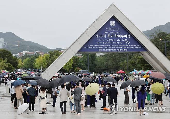 (서울=연합뉴스) 임헌정 기자 = 비가 내린 29일 서울 관악구 서울대학교 열린 제76회 후기 학위수여식을 마친 졸업생들이 교문 인근에서 사진을 찍고 있다. 2022.8.29