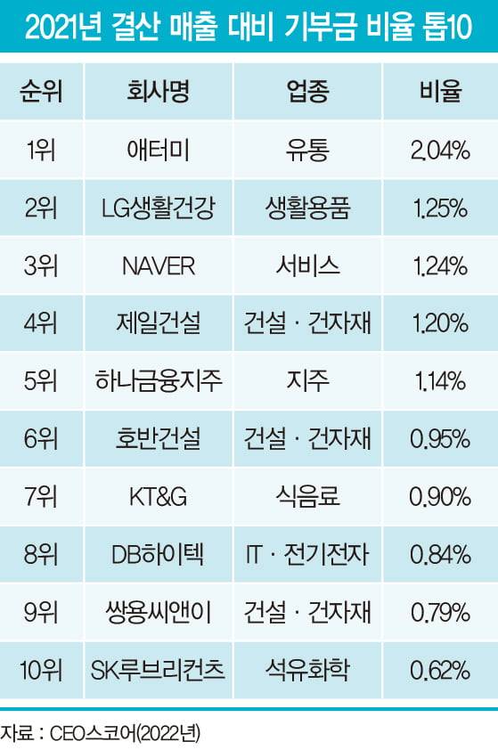 애터미의 기부금은 네트워크 마케팅업계는 물론 유통 산업, 더 나아 가 한국 500대 기업을 통틀어서도 최고 수준이다. CEO스코어의 자료 에 따르면 애터미가 속한 유통 업종은 2021년 매출액이 전년 대비 10% 증가했지만 기부금은 202억원(14.3%↓) 줄어 매출 대비 비율이 0.02% 하락한 것으로 나타났다. 반면 애터미는 기부금을 2020년 대비 두 배 이상 늘어난 248억원으로 늘려 매출 대비 기부금 비율이 2.04%인 것 으로 나타났다. 생활용품·유통 업종에서는 물론이고 2022년 지정 500대 기업 전체에서 유일하게 매출 대비 비율이 2%를 넘은 것이다. 영업이익 대비 비율은 무려 18%에 달한다.