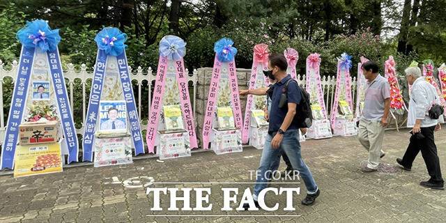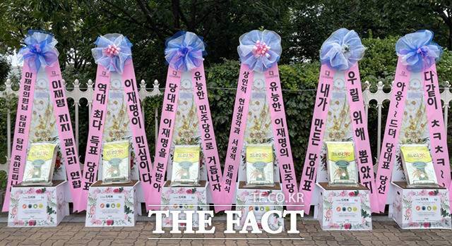 [더팩트ㅣ국회=이새롬 기자] 이재명 더불어민주당 대표의 임기가 시작된 29일 서울 여의도 국회 앞에 이 대표의 당선을 축하하는 당원들이 보낸 축하 화환이 놓여 있다.
