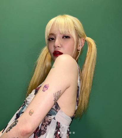 지민은 화려한 패턴이 들어간 원피스를 입고 마른 몸매를 자랑했다. 타투로 가득한 팔을 공개해 시선을 모았다.