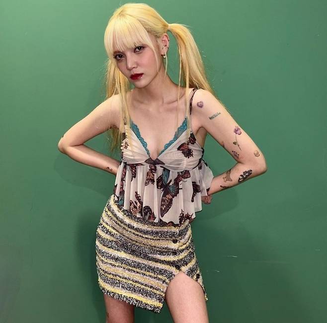 사진 속 지민은 어깨 라인을 드러낸 크롭 민소매 티셔츠에 미니스커트를 착용하고 강렬한 매력을 뽐내고 있다. 깡마른 팔다리를 과감하게 노출해 눈길을 끈다.