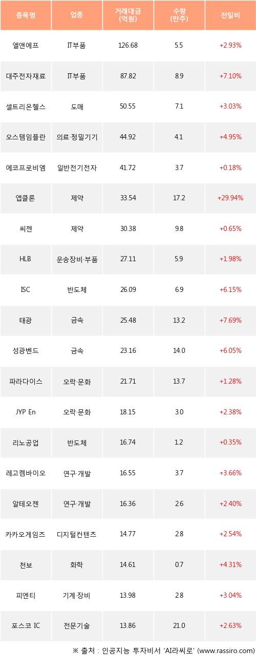 기관 투자자의 순매수 상위 20개 종목은 엘앤에프, 대주전자재료, 셀트리온헬스케어, 오스템임플란트, 에코프로비엠, 앱클론, 씨젠, HLB, ISC, 태광등이다.