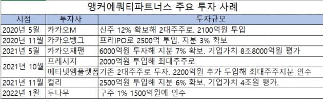 2015년 카카오페이지 투자로 인연을 쌓았던 카카오그룹 투자로 단기간 큰 수익을 본 점이 이런 전략 변화에 불을 붙인 것으로 회자된다. 2020년 이후에도 카카오M(2100억원), 카카오뱅크(2500억원), 카카오재팬(6000억원) 등에 잇따라 투자하며 카카오 투자팀과의 인연을 이어갔다. 특히 카카오뱅크는 프리IPO로 투자한지 약 8개월만에 성공적으로 증시에 안착하면서 앵커PE도 '대박'을 눈앞에 뒀다.