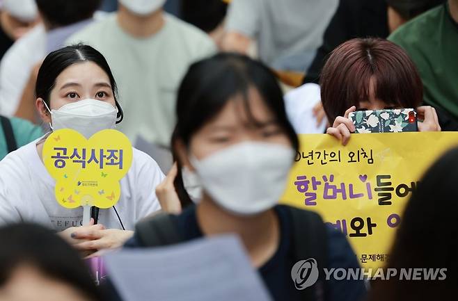 (서울=연합뉴스) 홍해인 기자 = 정의기억연대 주최로 31일 오후 서울 종로구 주한일본대사관 부근에서 열린 제1559차 일본군 성노예제 문제해결을 위한 정기 수요시위에 참가한 일본 단체 콜라보(Colabo) 회원들이 동시통역기를 귀에 꽂은 채 팻말을 들고 시위에 참여하고 있다. 2022.8.31
