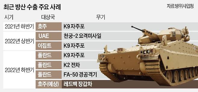 한국 방산업계의 글로벌 진출이 속도를 더하고 있다는 분석이다. 지난해 국내 방산 수출 규모는 약 9조원이었지만 올 들어 최근 맺은 폴란드와의 전차·자주포·경공격기 기본계약 규모만 25조원에 달할 것으로 추정된다. 올 상반기엔 폴란드 외에 아랍에미리트(UAE)와 천궁-2 요격미사일, 이집트와 K9 자주포 수출 계약을 맺었다.