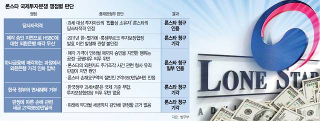 중재판정부는 금융위가 외환은행 매각 가격이 인하될 때까지 승인을 지연시킨 것과 관련해 “금융 당국의 권한 내 행위가 아니므로 공정·공평 대우 의무 위반에 해당한다”며 정부의 책임을 인정했다. 다만 이 과정에서 론스타의 형사 유죄판결이 나오는 등 귀책이 있다고 판단해 인하된 매각 가격의 절반인 2억 1650만 달러만 우리 정부가 배상하라고 판정했다.