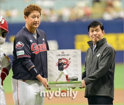 이대호가 고척에서도 추억을 쌓았다..'고척돔 흙' 피규어 받고 작별