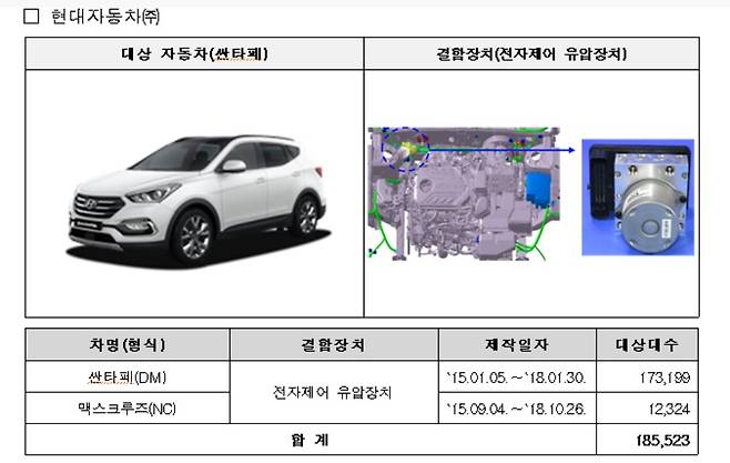 현대차에서 제작, 판매한 싼타페 등 2개 차종 18만5,523대는 전자제어 유압장치(HECU) 내부 합선에 의해 화재가 발생할 가능성이 확인됐다.