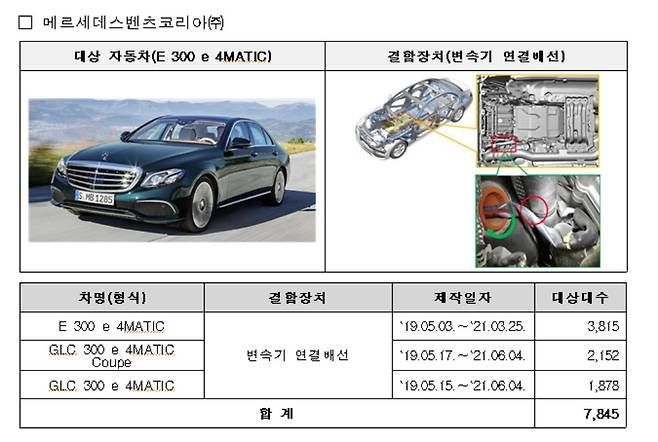 벤츠코리아에서 수입, 판매한 E 300 e 4매틱 등 3개 차종 7,845대는 변속기 연결배선이 전방 동력전달축과의 간섭으로 손상되고 이로 인해 변속기가 제대로 작동되지 않아 안전에 지장을 줄 가능성이 확인돼 시정조치에 들어간다. 9월2부터 벤츠코리아 공식 서비스센터에서 무상으로 수리(점검 후 수리)를 받을 수 있다.