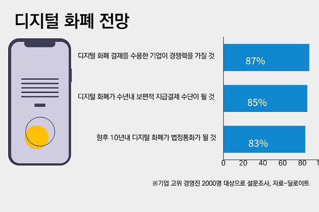 디지털 화폐 결제는 더욱 보편화할 전망이다. 최근 딜로이트가 기업 고위 경영진 2000명을 대상으로 설문조사한 결과, 미국 소매기업 4곳 중 3곳은 2년 내 디지털 화폐 지급결제를 수용할 것이라고 밝혔다. 적용 분야는 화장품, 전자, 패션, 식음료, 운송, 레저 등으로 다양했다.