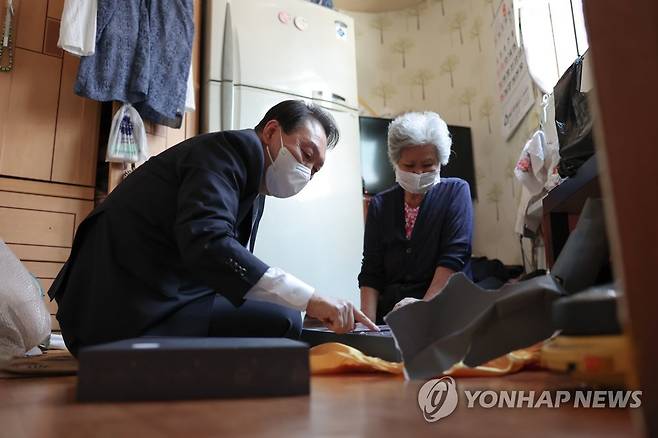 (서울=연합뉴스) 서명곤 기자 = 윤석열 대통령이 1일 오전 서울 종로구 창신2동 주민센터에서 위기가구 발굴 체계 강화를 위한 현장 간담회를 마친 뒤 인근 기초 생활 수급 독거노인 가구를 방문, 추석선물을 전달하고 있다. 2022.9.1