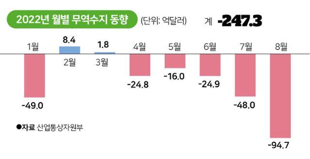 1일 산업통상자원부에 따르면 올해 1~8월 누적 무역수지 적자는 247억3,000만 달러다. 2월과 3월 각각 8억4,000만 달러, 1억8,000만 달러 흑자를 반짝 기록하긴 했지만 그 외엔 모두 적자다. 우리나라가 무역수지 통계를 작성하기 시작한 1956년 이후 66년 만에 사상 최악의 수치다.
