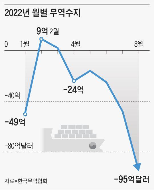 지난달 무역 적자 95억달러(약 13조원)는 역대 최대 무역 적자를 냈던 1996년 한 해 적자 206억달러의 거의 절반에 이르는 규모다. 액수도 충격적이지만 환율이 치솟는 상황에서도 수출이 둔화하면서 적자가 5개월째 이어지고 있다는 점에서 우려가 커지고 있다. 고환율이 우리 수출을 늘리며 무역수지 개선에 기여했던 과거 IMF 외환 위기나 글로벌 금융 위기 때와는 완전히 다른 양상이 벌어지고 있는 것이다. 글로벌 경기 침체 우려가 커지며 수요가 쪼그라드는 데다 수입에서 큰 비중을 차지하는 에너지 가격이 급등하면서 위기가 심화하고 있다는 분석이 나온다.