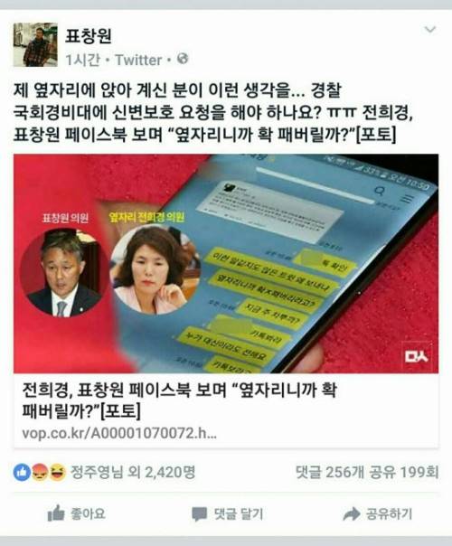 해당 보도에 따르면 전 의원은 자신의 보좌진에게 "옆자리(표창원)니까 확 패버리라고?", "지금 주 차뿌까?(확 차버릴까?)"등의 막말을 했다.