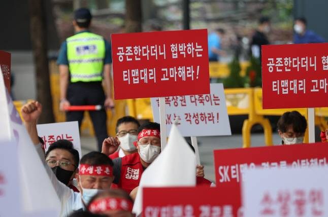 [한국대리운전총연합회 관계자들이 1일 오후 서울 종로구 SK 본사 앞에서 궐기대회를 열고 티맵모빌리티의 대리운전 시장확장 철회와 SK 본사의 중재를 촉구하고 있다. (사진=연합뉴스)]