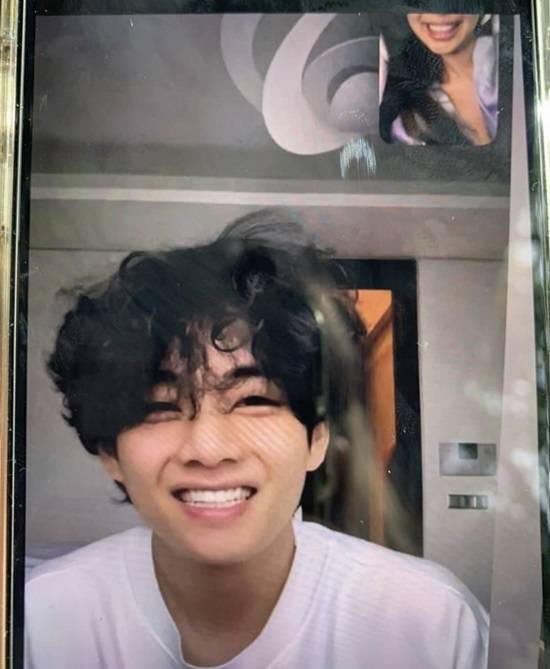 이어 영상통화 중인 뷔의 화면 캡처 사진도 공개됐다. 카메라 앞에 앉은 뷔의 해맑은 웃음이 시선을 사로잡는다. 화면 구석 나온 상대방의 화면에는 제니로 추정되는 한 여성의 하관이 담겼다.