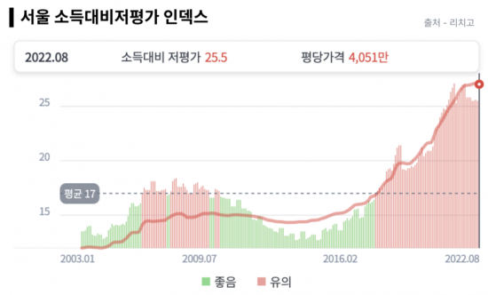 이 기준에 따라 측정된 2022년 8월 서울의 PIR은 25.5다. 비교기간(2004.01~2022.08) 중 가장 높은 수준이다.