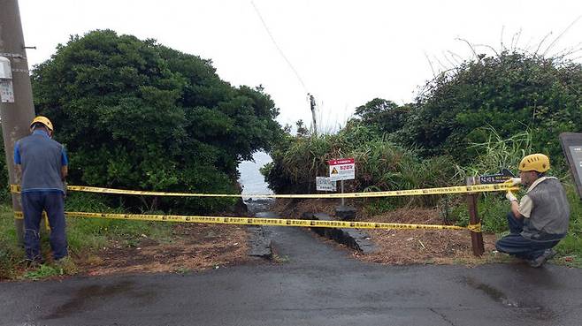 출입 통제선이 설치되고 있는 제주시 수월봉 입구